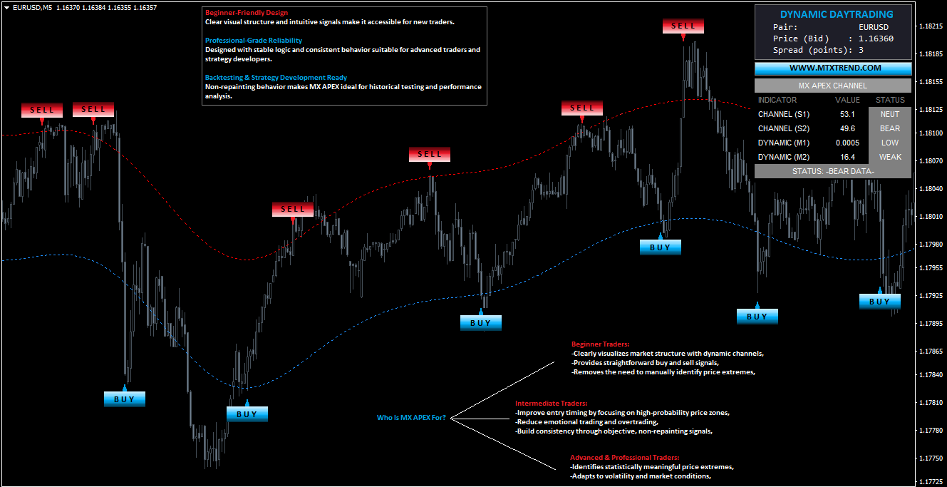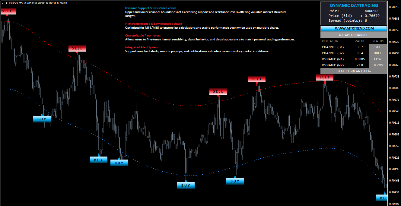 The MX APEX indicator is a sophisticated channel-based tool for MT4 and MT5 that: