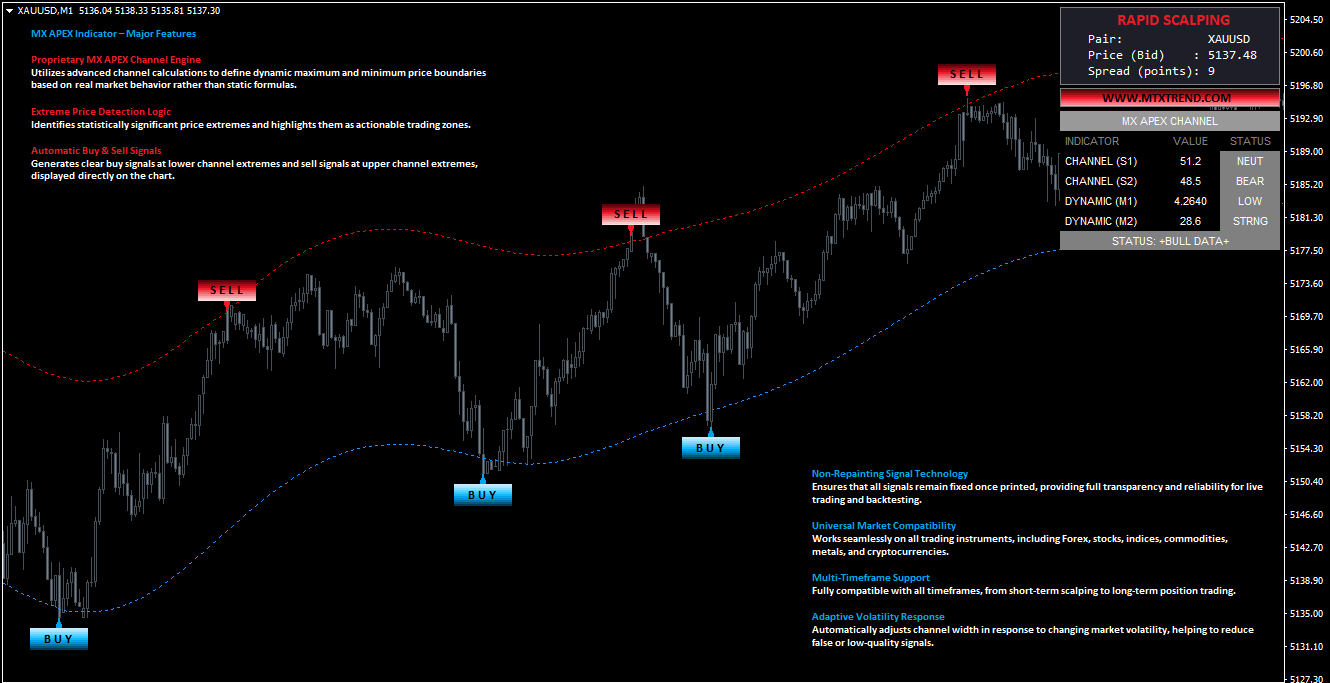 MX APEX can be used for scalping on lower timeframes, especially during high-liquidity sessions. For best results, tighter channel settings and additional confirmation filters are recommended.
